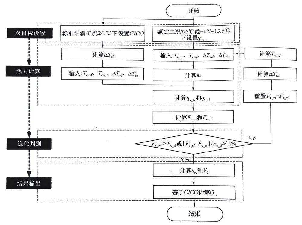 新方法打破常规“制热为单一目标”,耦合抑霜目标(CICO,可表征空气源热泵机组结霜程度的无量纲综合本构参数),参数涉及室外换热器面积、压缩机行程容积、室外风机风量、压缩机运行频率,重构空气源热泵机组研制流程,建立“制热优先、兼顾抑霜”的抑霜型空气源热泵机组研制新流程。
