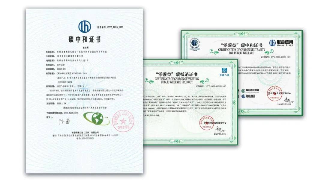 2025年8月,贵州高速集团光储充一体化零碳办公园区自身运营过程产生了71.2tCO₂e温室气体排放量,通过“绿交所”购买了72吨建筑碳信用产品(长春益田,PB43101709009)进行抵消,实现碳中和。